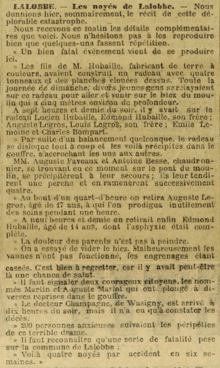 L’an mil huit cent vingt cinq, le douze du mois de juin à dix heures du matin par devant nous Maire et officier de l’Etat Civil de la commune de Lalobbe ..........sont comparus Philippe Baudoin plafonneur agé de trente cinq ans, domicilié à Rogiville, ......., premier témoin et François Canon ......., père et bel oncle du décédé, lesquels nous ont déclaré que le onze du présent mois de juin, à midi, Baudoin Antoine Eugène, âgé de huit ans, né et domicilié au dit Rogiville, ......., est décédé noyé dans le bief du moulin de Lalobbe .......